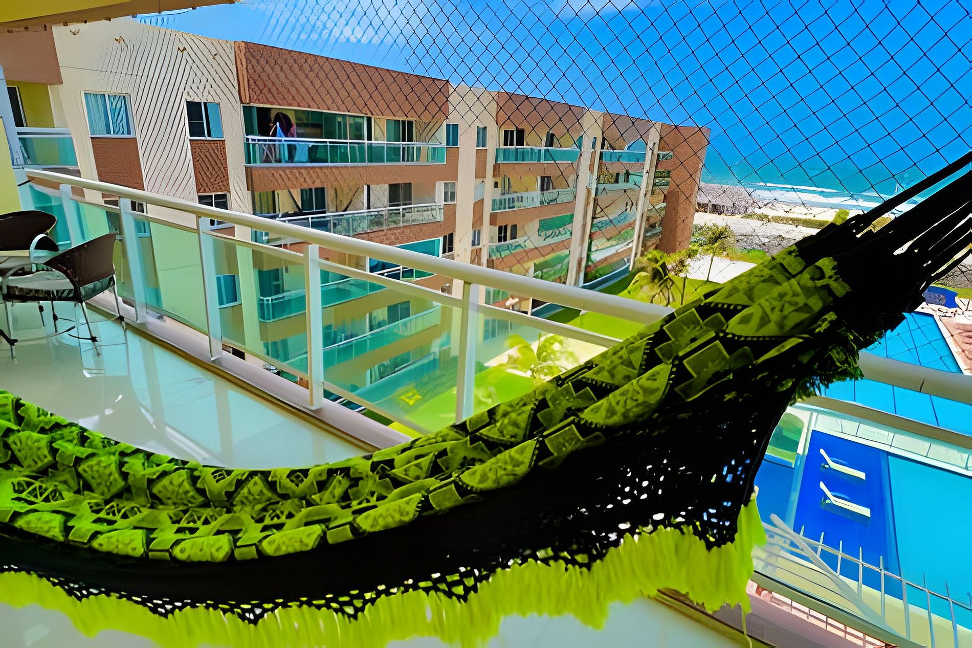 Apartamentos de 03 quartos ideal para familias grandes, com grande Varanda com Vista para o Mar e Piscina, Condômino Fechado com segurança e grandes itens de lazer e diversão, você vai ter a praticidade de ter uma cozinha com todos utensílios domésticos, Varandas com Vista para o Mar, apartamentos com Wifi de excelente qualidade, camas de casal Queen na suíte, Ar Split nas Suítes e Ventilador na Sala, Smartvs de Led, Roupas de Cama e Banho, estacionamento gratuito !