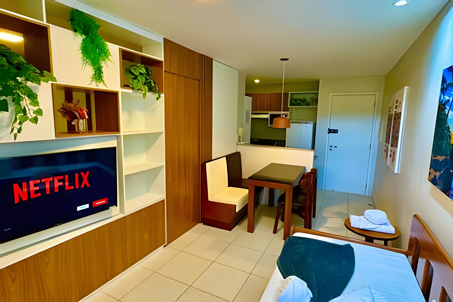 Lindo e Sofisticado apartamento com vista Top para a Piscina, divisoria entre sala e suíte dando privacidade, deal para descansar e relaxar bastante, roupas de cama e banho premium, cozinha completa com todos utensilios e até Airfryer, Smartv grande, ambiente todo climatizado bem equipados e decorado. 01 vaga de garagem .