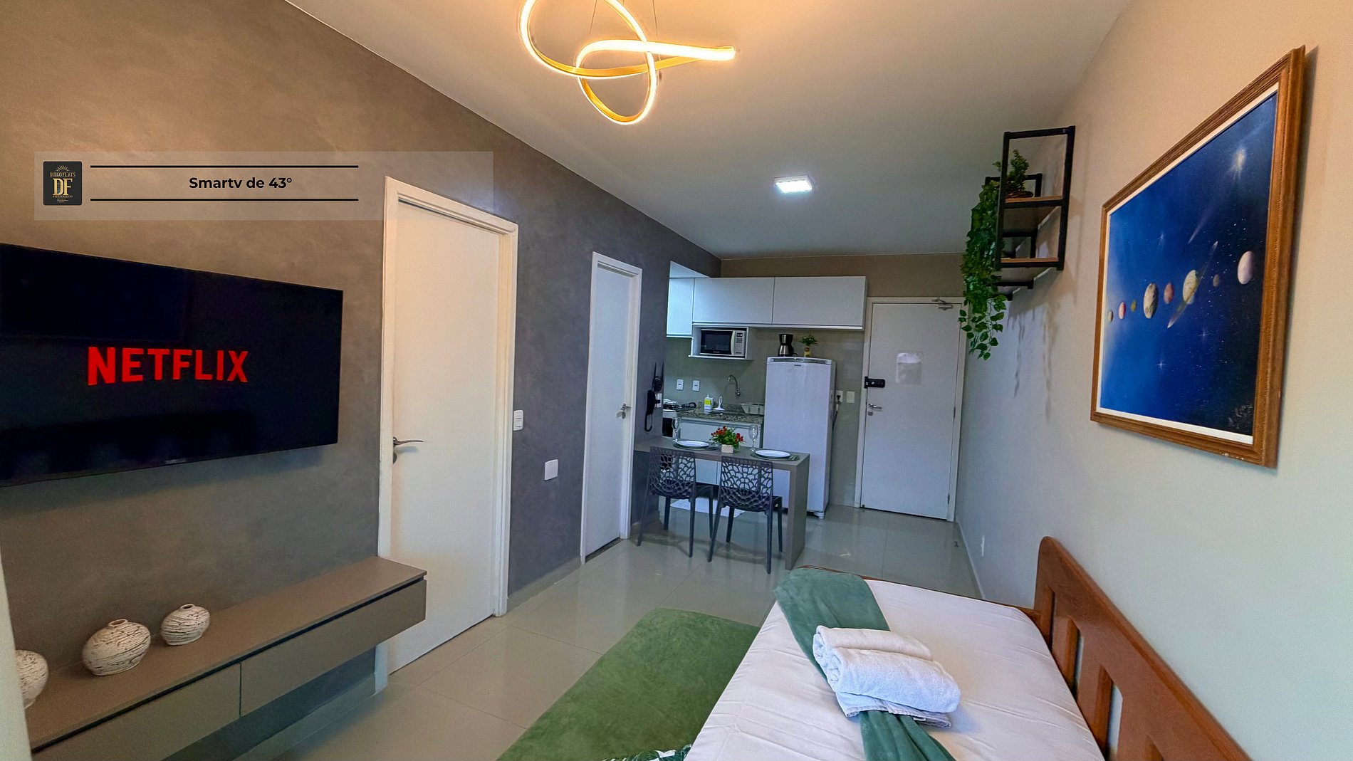 Estúdio moderno e completo na Praia do Futuro.Localizado em condomínio fechado com segurança 24h e lazer completo! Acomoda com conforto até 4 pessoas, oferecendo cama Queen, ar-condicionado split na suíte e ventilador na sala. Cozinha equipada com todos os utensílios, Filtro de água e Air Fryer, Wi-Fi rápido, Smart TV e roupas de cama e banho inclusas. Aproveite a varanda com vista para o mar e o estacionamento gratuito. Ideal para quem busca praticidade, conforto e uma experiência à beira-mar.